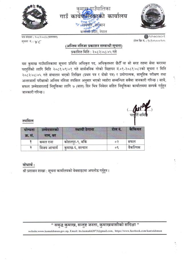 अन्तिम नतिजा प्रकाशन सम्बन्धी सूचना ।