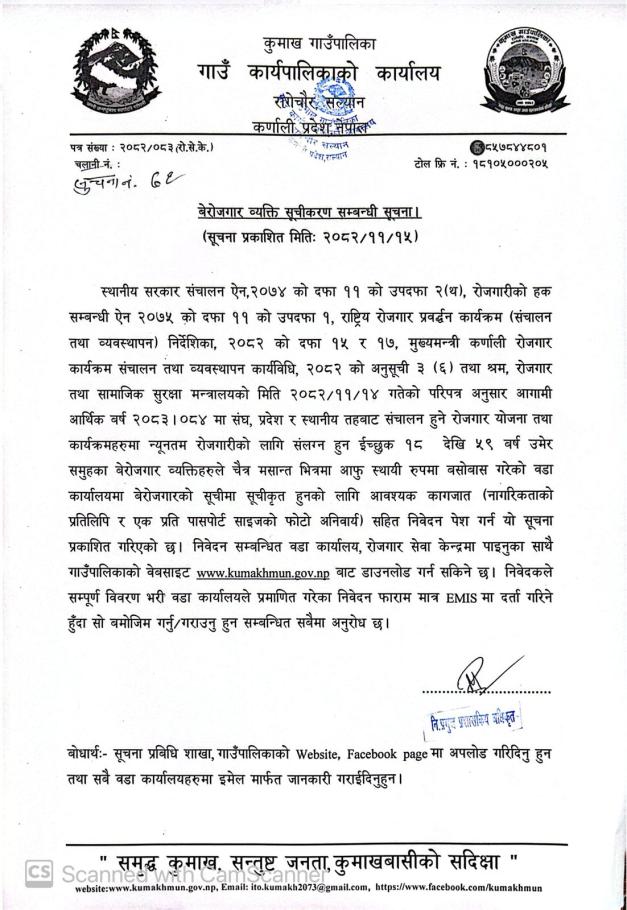 » व्यरोजगार ब्यक्ति सूचीकरण सम्बन्धि सुचना ।
