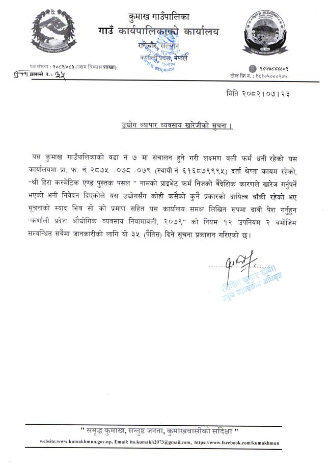 » उद्योग व्यापार व्यवसाय खारेजीको सूचना ।