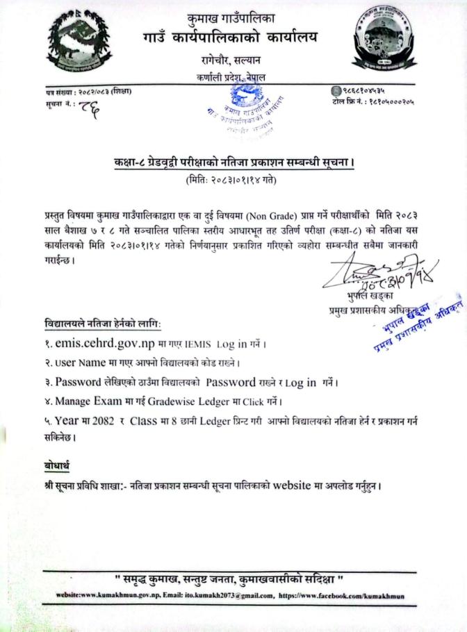 कक्ष्या -८ ग्रेडबृद्दी परिक्ष्याको नतिजा प्रकाशन सम्बन्धि सूचना ।