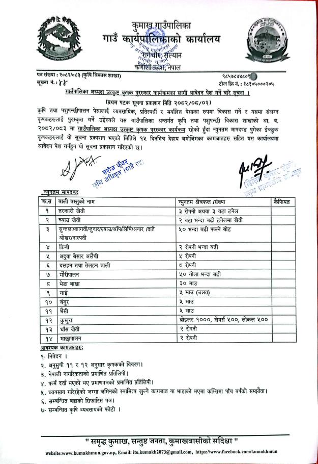 गाउँपालिका अध्यक्ष उत्कृष्ट पुरस्कार कार्यक्रमका लागि आवेदन पेश गर्ने बारे सूचना ।
