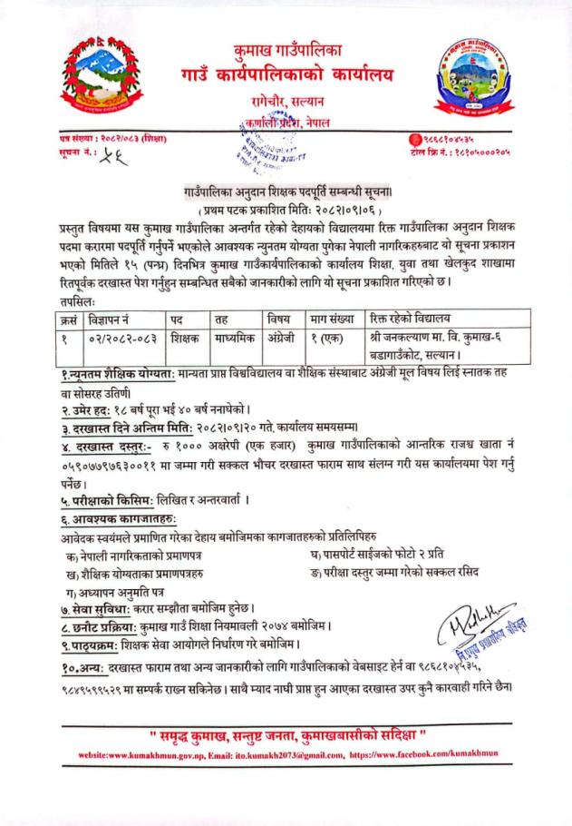 गाउँपालिका अनुदान शिक्षक पदपुर्ति सम्बन्धी सुचना ।