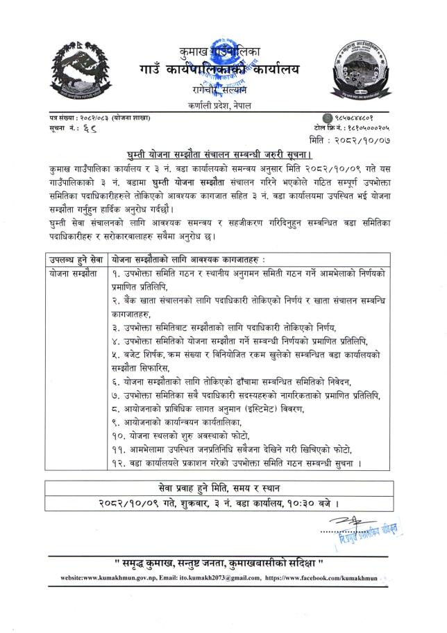 घुम्ती योजना सम्झौता संचालन सम्बन्धी जरुरी सूचना । (कुमाख गाउँपालिका ३ नं. वडा कार्यालय, मर्मपरिकाँडा सल्यान)