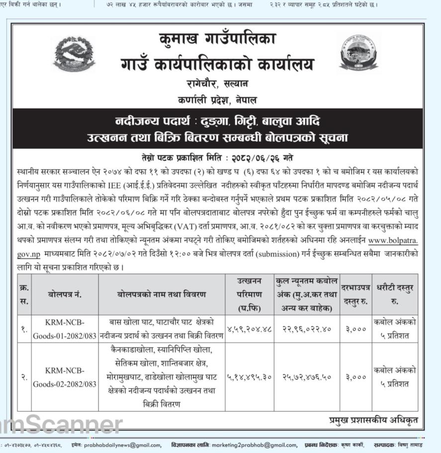 नदिजन्य पदार्थ : ढुङ्गा, गिट्टी, बालुवा उत्खनन् तथा बिक्री वितरण सम्बन्धमा बोलपत्रको सूचना ।
