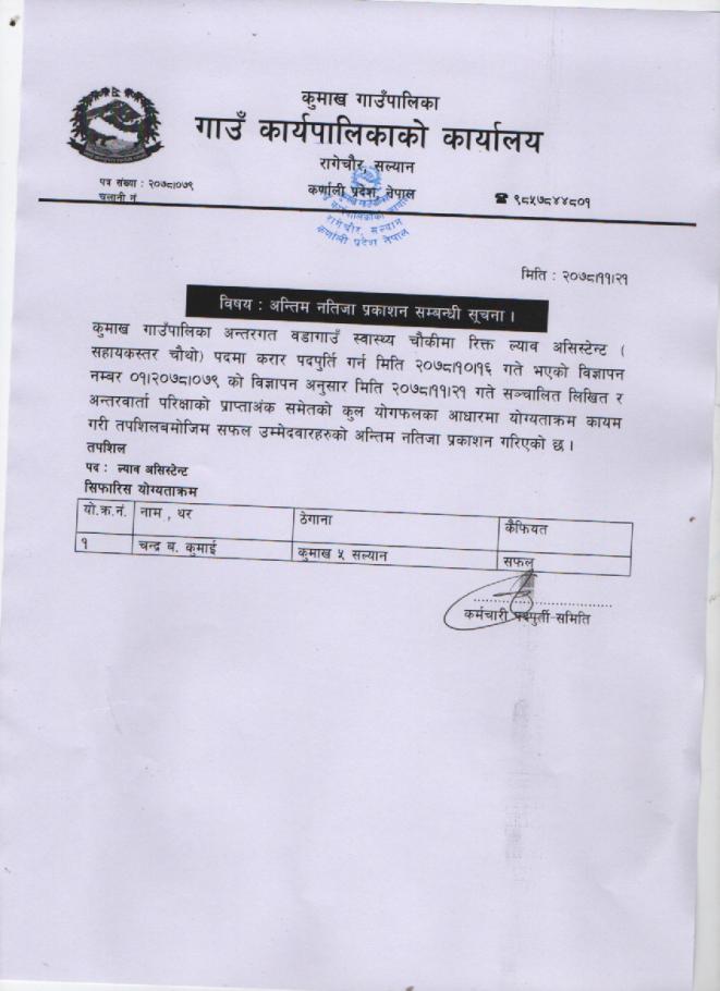 ल्याव असिस्टेनको अन्तिम नतिजा प्रकाश गरिएकाे सम्बन्धमा ।