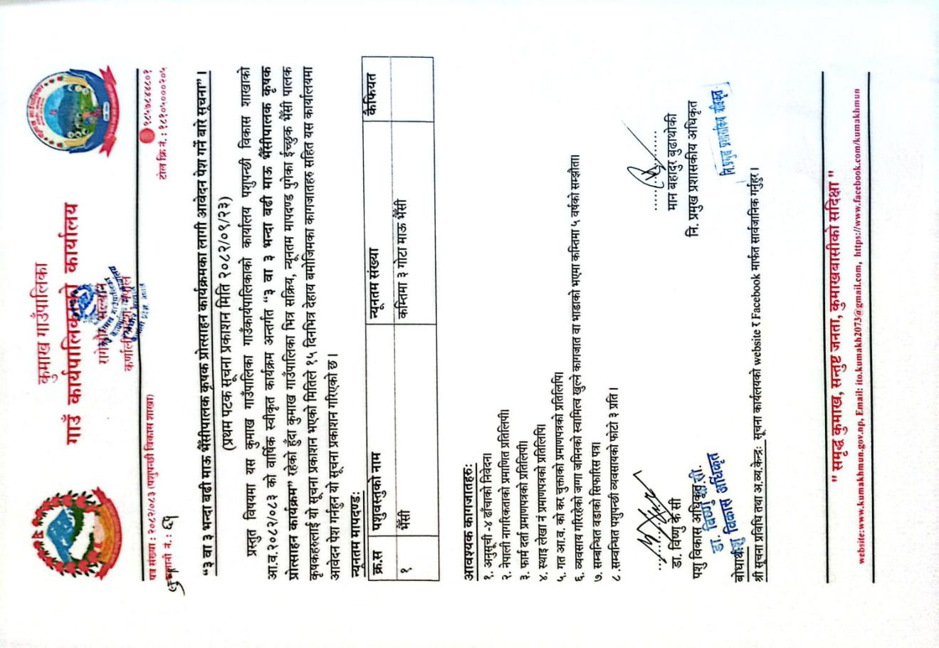 » ३ वा ३ भन्दा बढीमाऊ भैसीपालक कृषक प्रोत्साहन कार्यक्रमका लागि आबेदन पेश गर्ने बारे सुचना।